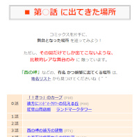「第○話に登場した場所を 知りたいな〜」という あなたには、 話数から、モデルになった場所を 逆引きできる一覧表 が お勧めです。 |