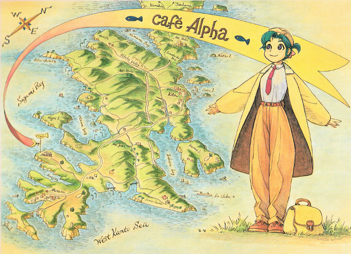 ちなみに、 マリンパークより さらに南にある 諸磯 の「浜ノ原」という岬からは、 ギリギリで「北の大崩れ」も視界に入るため、 「こここそがカフェアルファ建設予定地である!」 と主張するファンの方も一部にいるのですが… 残念ながら、 浜ノ原 を「カフェアルファ建設予定地」 とするのは 無理がある と思います。 理由は 2つ … 1つは、諸磯が 「三浦半島 西海岸の、最南端の岬」 であること。 仮に ここにカフェアルファが あるとすると、 第3話の背景(南のほう)に、 『西の岬の彼方の建物』が 描かれている点が矛盾してしまう のです。 諸磯は「最南端」なのですから、 その南に さらに別の岬など あるはずが無い からです。 そして もう1つは、 そもそも、『ポストカードブック』内の ヨコハマ地図と 矛盾している 点です。 下の写真が、 その ヨコハマ地図の全体像 と、 カフェアルファ近辺の拡大図 になりますが、