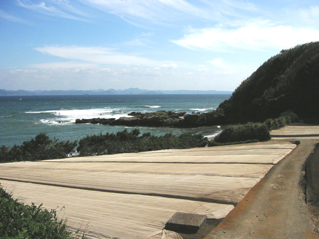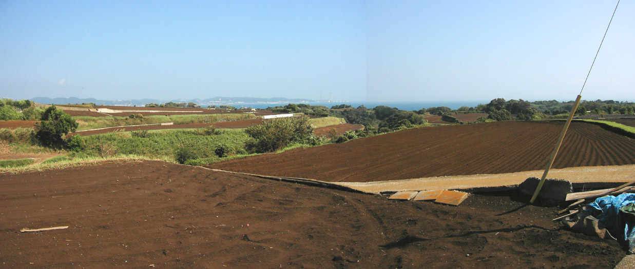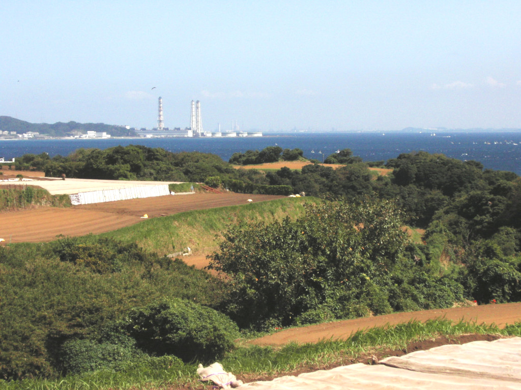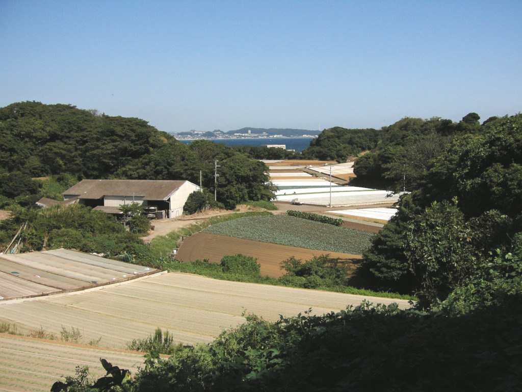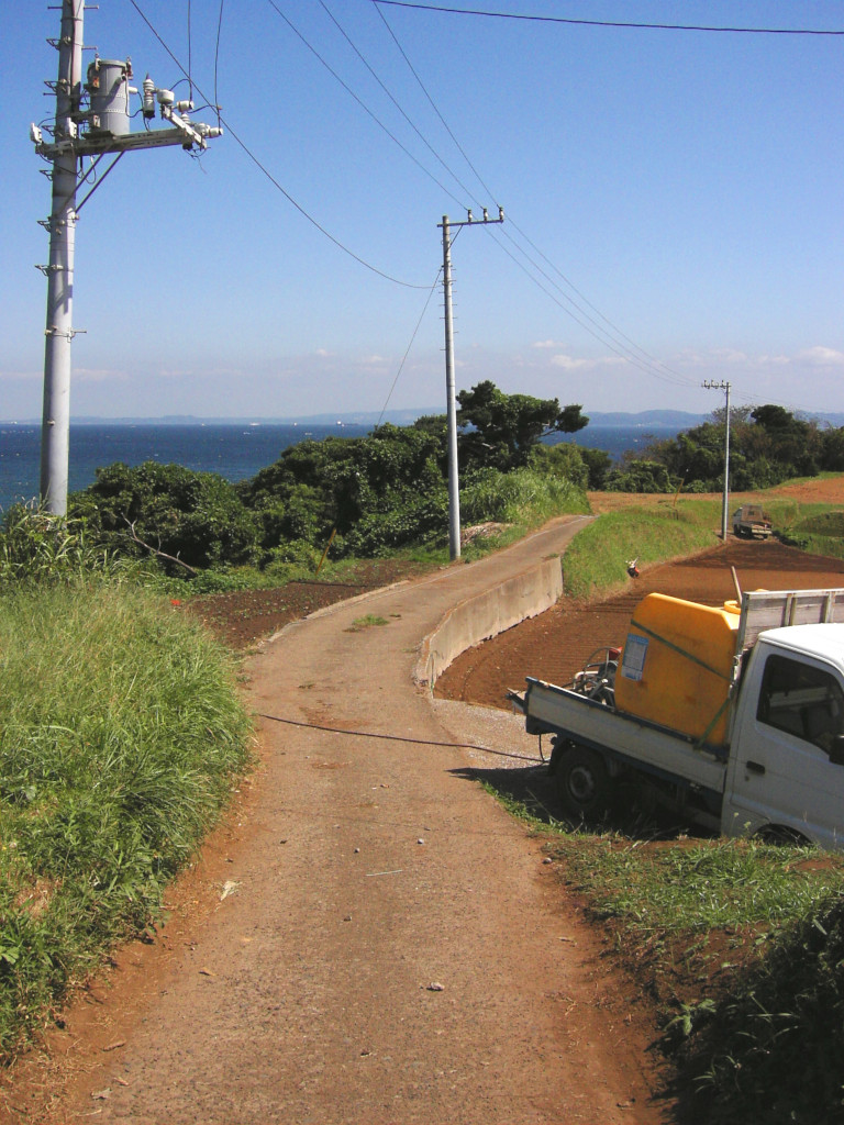 アルファさんの お気に入りポイントの1つ、 『農道の高地』… 彼女のセリフから、 該当地についてのヒントが いくつか挙げられます。 『大三叉路の先を 東へ』 『農道の高地』 『千葉が大きく すぐ近くに見える』 『青いトタンの小屋』 以上から、 引橋交差点 を少し南に進んだあたりを 左折(東)した先の、 房総半島 が よく見える、 「高台」の農道で、 景色の中に 「青いトタン小屋」がある場所… という事が分かります。 そこで まず思い出したのが、 『剱崎灯台』の近くの 畑の広がる丘、 柳作 でした。 とりあえず、 現地の風景 をご覧下さい。 漫画内の風景の雰囲気と、 なかなか よく似ていませんか? 「青いトタン小屋」が無いのが 悔やまれますが…(笑)