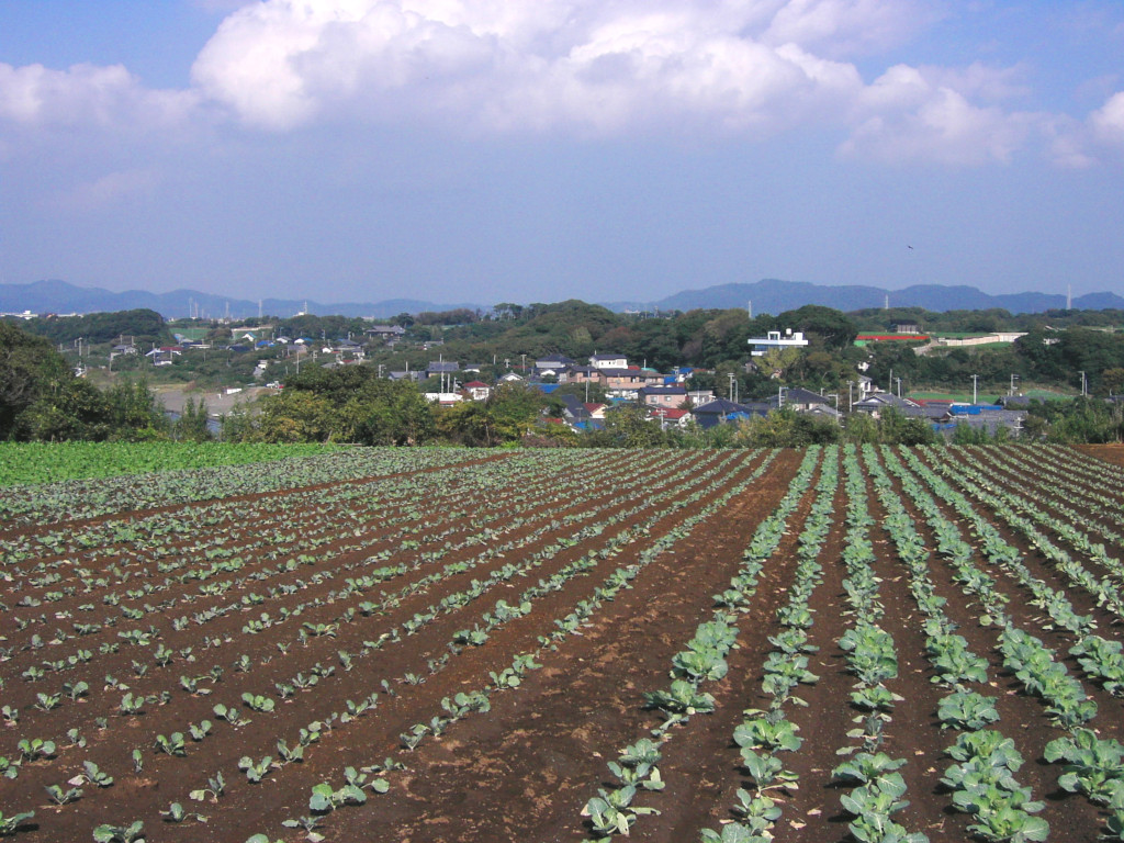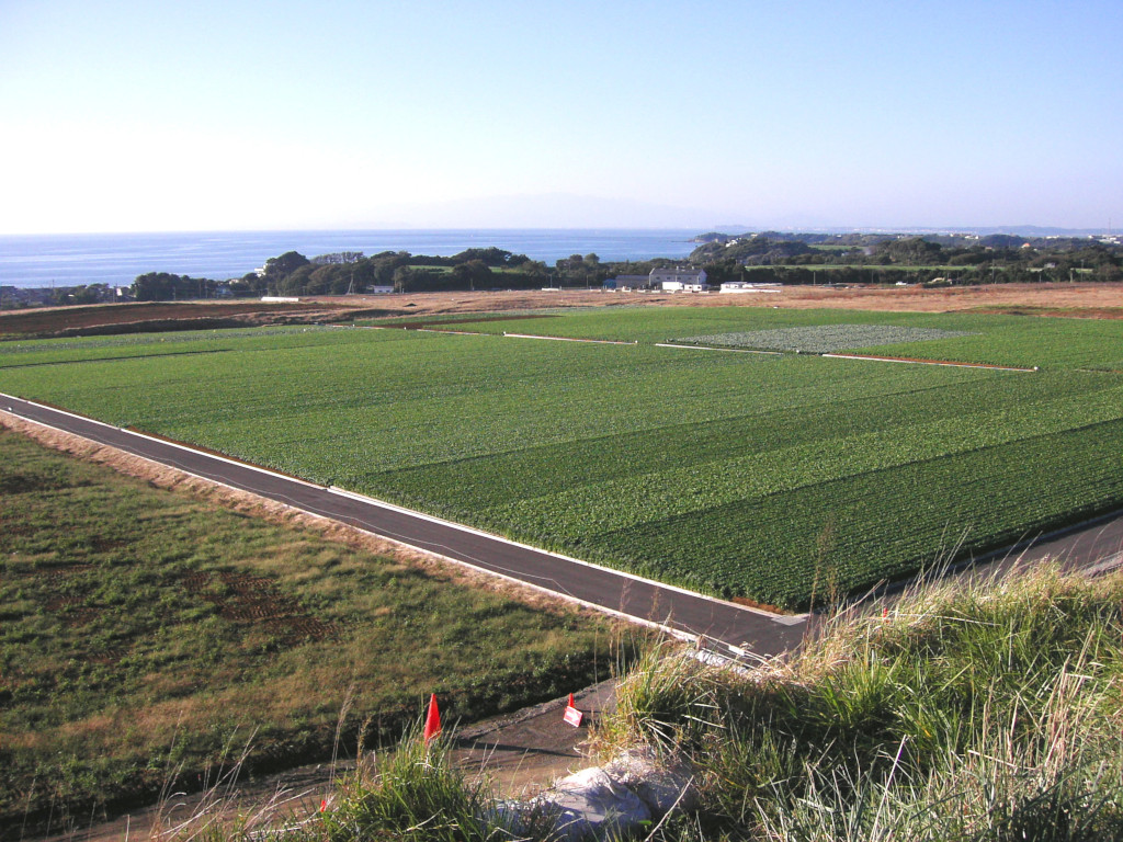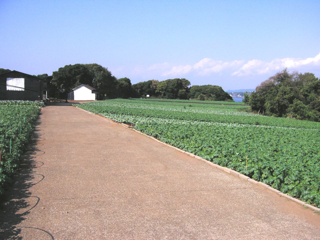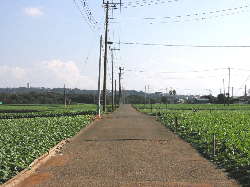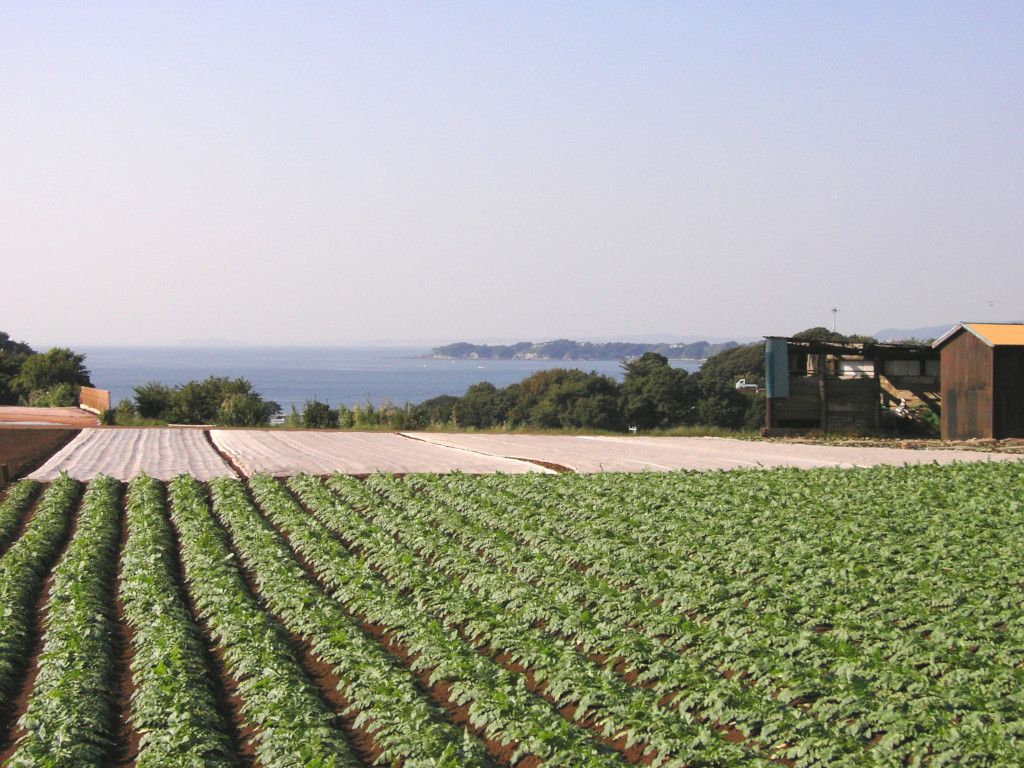丘の上の道を、 大きく時計回りに進みます。 北西を見ると、 大根葉の向こうに、しっとりと青い海 …