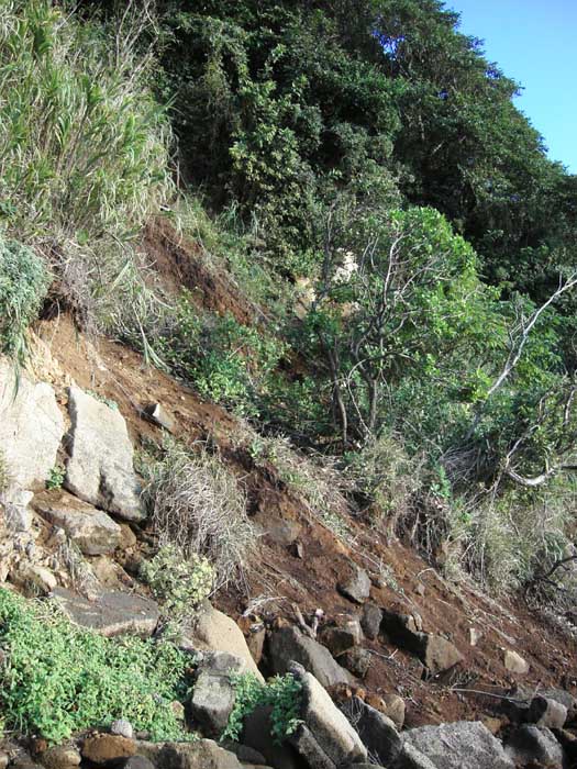 風雨のためか、 一部の表面が草木をともなって ズリ落ちつつありました。 心配になって しばらく待ってみましたが、 緑の髪の娘さん が デジカメつかんだまま 転がり落ちてくる ことは ありませんでした。 ホッとするやら、残念やら…(笑) |
