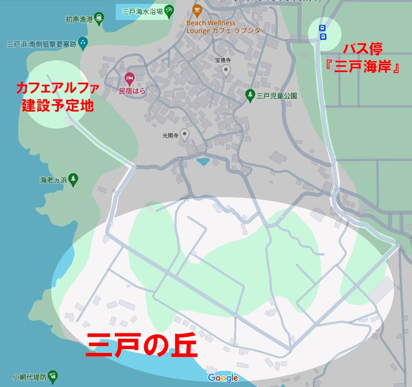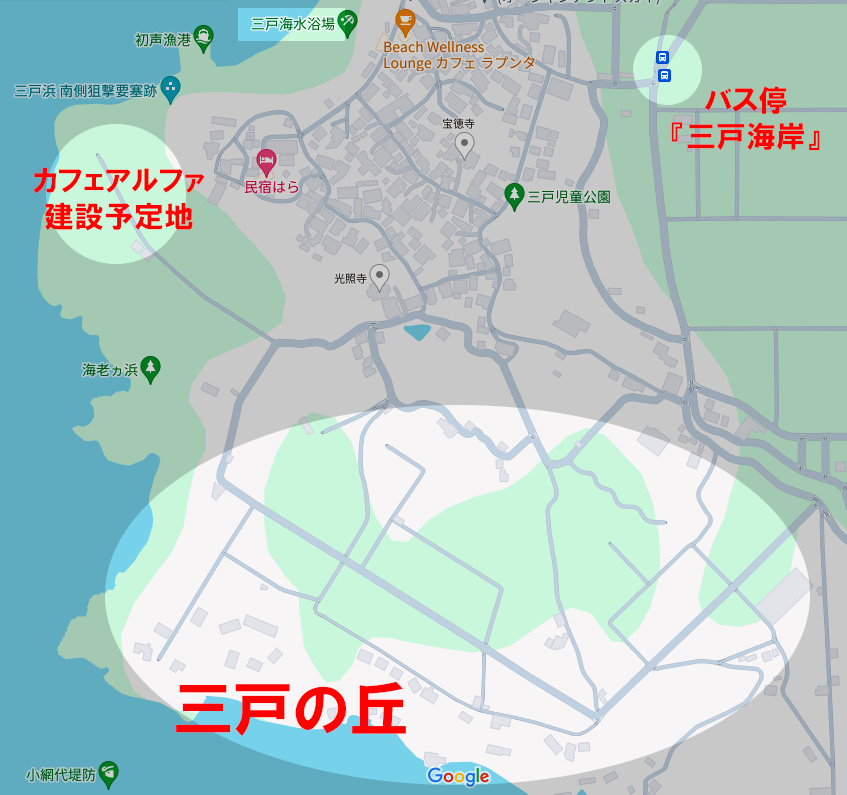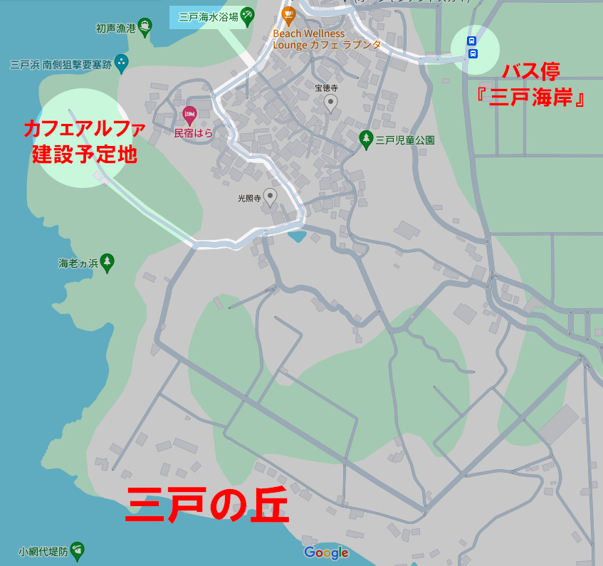 まずは アクセス方法 です。 …と その前に、 駅前のコンビニなどで 買い出し をしてから出かけましょう。 三戸海岸 近辺には、 小さな農協のような店が1軒 (品ぞろえは、正直そこそこ) しかありません。 (その お店も、2023年12月に調べてみたところ、 すでに無くなってしまっている ようです) ちなみに 移動距離は、 京急『三崎口』から 片道3キロ弱・往復6キロ弱 です。 |