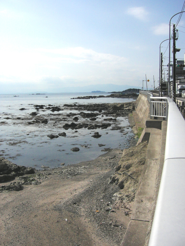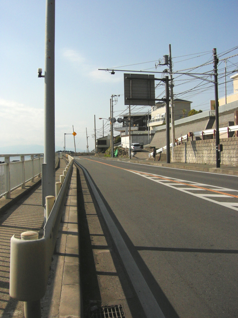 これより漫画内に近い構図の写真は、 件の交差点の真ん中から、 遠距離ズーム撮影でもしないかぎり 不可能でしょう。 (漫画内のコマの、左側のガードレールの角度が 実物よりも急なのは、このコマを描く際の資料写真が 遠距離からの ズーム写真だったからでは? と 推測しています) 彼方に見える 北の大崩れ と 江ノ島 も、 この成功を喜んでくれているように見えます(我田引水) |