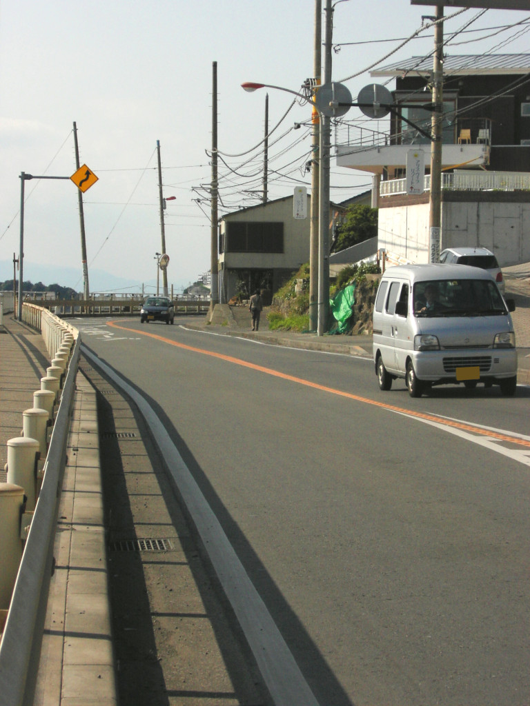 この道は、 若かりし日の 子海石先生 と おじさん が、 渋滞道路 を見に行く過程で通った場所です。 波の間をねらって、 「あゴー!」の掛け声とともに突っ切ります。 (そして、波かぶります)