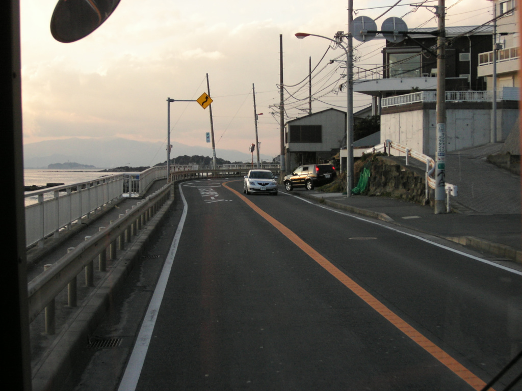 近くの交差点の真ん中から撮れば、 漫画の構図に近くなるが、 交差点内で撮影して 周りの自動車に迷惑をかけるのも心苦しい… 一体どうすれば…?? …と、悶々としていたのですが、 ある日、『バスの中(座席)から 撮影すればいいじゃん』 という 呆気ない結論に達しました(苦笑) というわけで、2008年 2月に、 バスに乗車して現地へ… 問題は、撮影に適した最前列左側の座席を 取れるかどうかだったのですが、 バス停「立石」の少し前で たまたま その席が空いたので、 別の停留所に停車した瞬間を狙って、 それまで自分が座っていた中央あたりの席から ササーッと前進してゲットしてしまいました。 「いい歳こいたオサーンが、 セッセと眺めのいい席を取りに行ってんじゃねーよ」 と 不快に思われたであろう 地元の皆さん、 ごめんなさい。<(_ _)>(汗 前に動いた僕を「降りる人」だと思って、 他に降りる人がいなかったため、 わざわざ前部ドアを開いてくれた 京急バスの運転手さん、 ごめんなさい。<(_ _)>(汗 皆さんの協力(?)の おかげで、 こんな素敵な写真が撮れました。