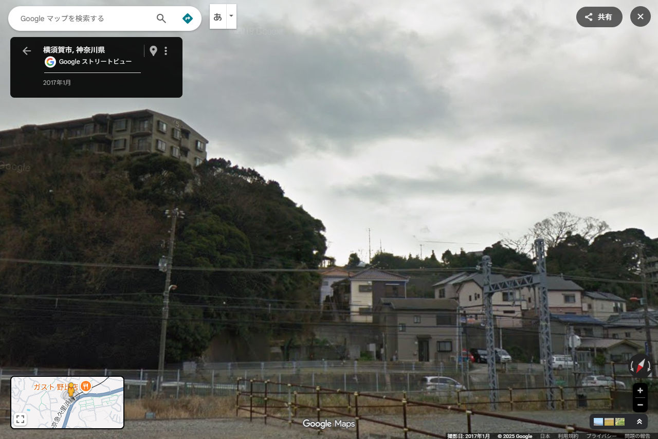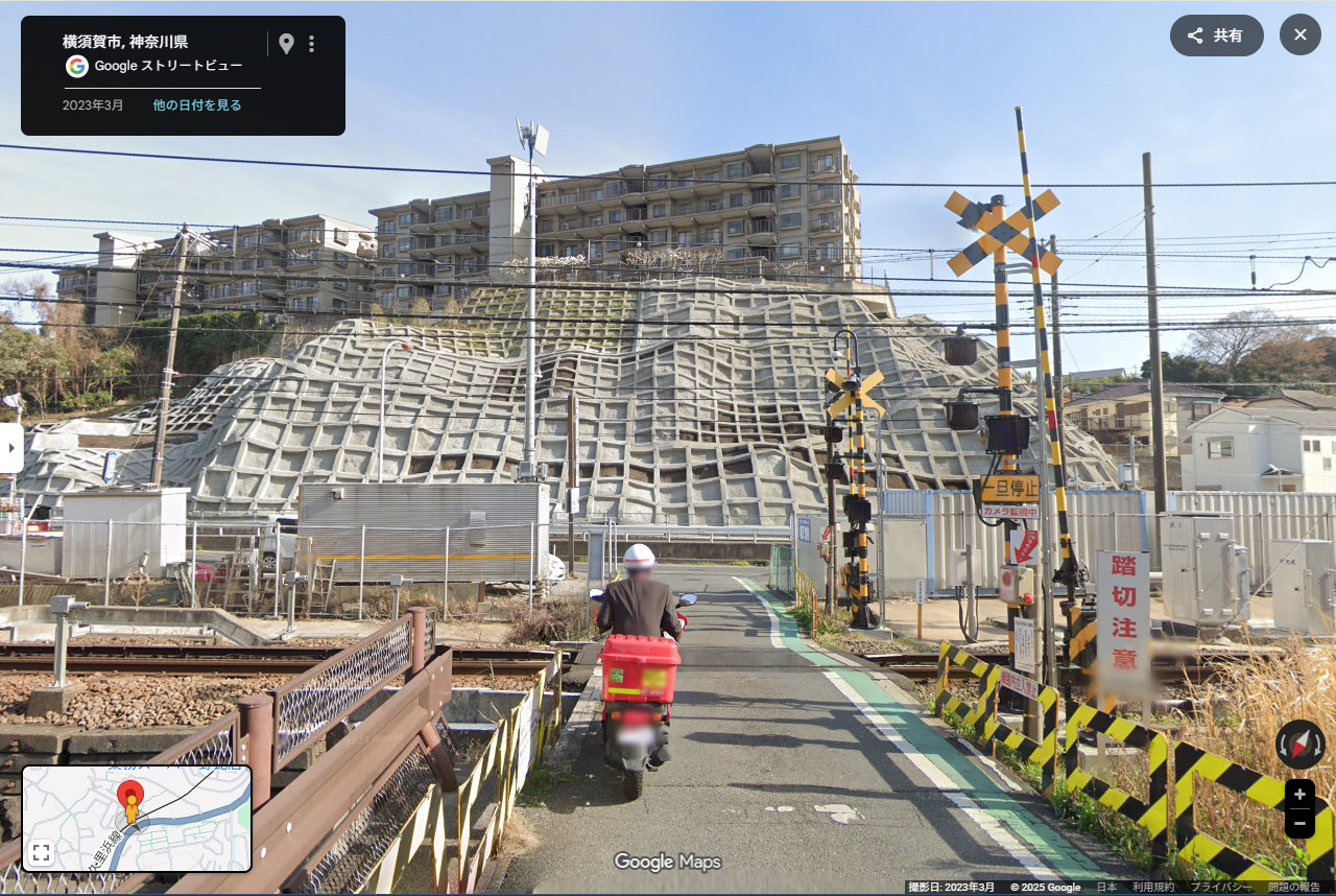 次に【シーン3】を見ると、 元は 高架だった線路 で、 所々に下をくぐれる場所がある (それで ココネの足元は、線路が むき出しに見えている) らしいことが分かります。 先ほど 野比 近辺にの浜辺を 歩いていたことを考慮すると、 この線路は 現在の 『京急』(京浜急行)であり、 (JRは『久里浜』が終点 で、ここまで延びていません) 場所は、 『京急長沢』『津久井浜』『三浦海岸』の 3駅のあたりの線路の いずれか と 考えられます。 (線路が 高架 になっていて、 夕凪時代の海面上昇で付近が水没する と 考えられるのは、この範囲だけだからです)