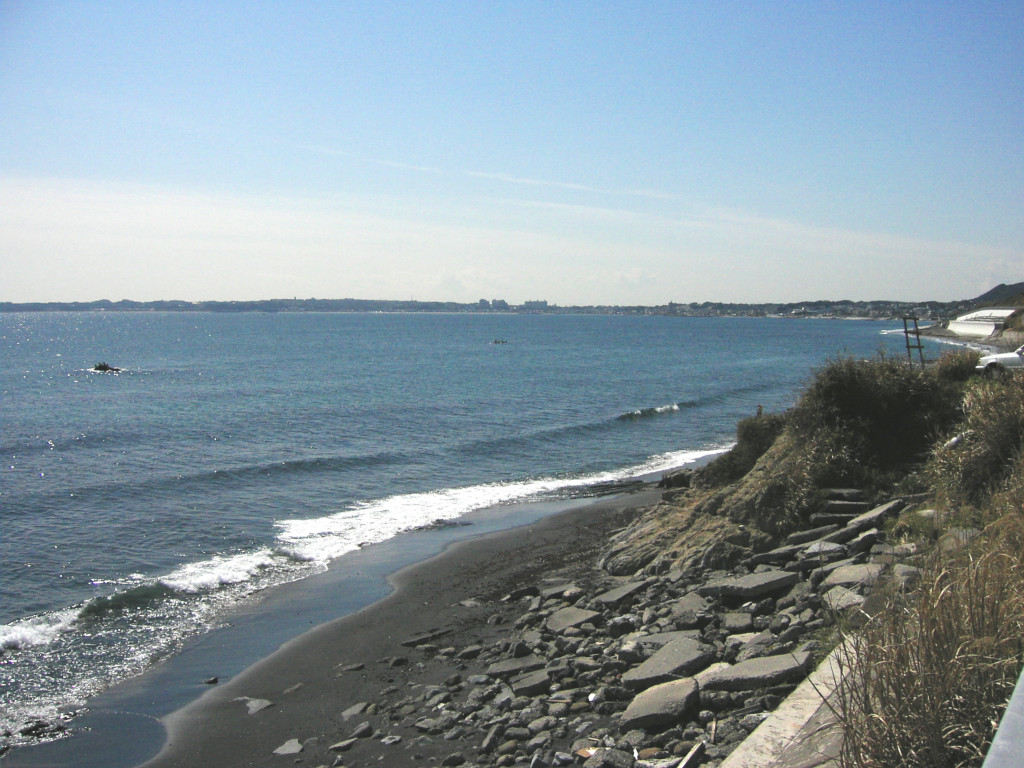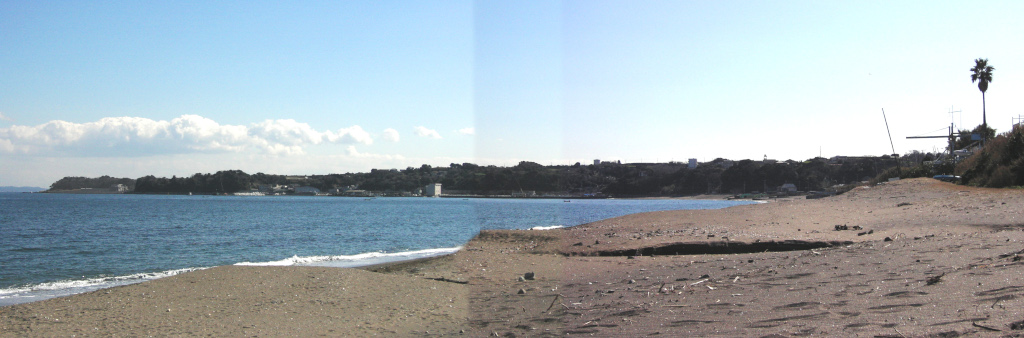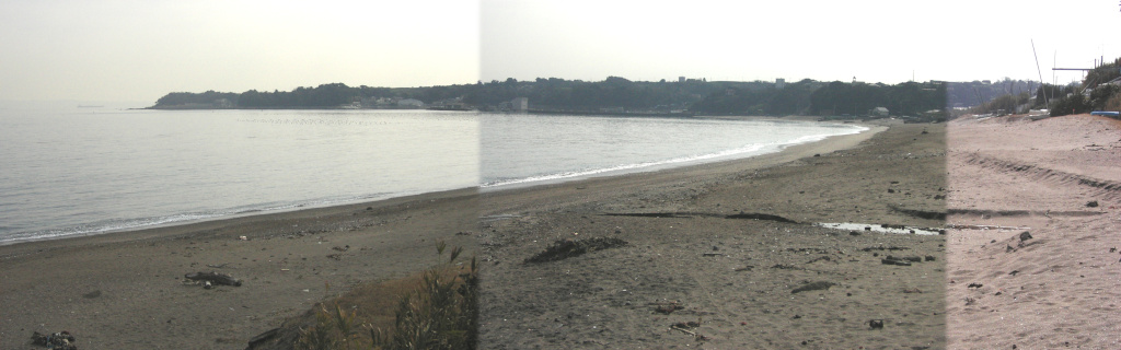 これについて、 実は 地図を見ていて 1つだけ心当たり がありました。 三浦海岸 の 南1.5キロ、 バス停でいうと『役場下』あたりから、 南の 雨崎方面を見ると、 この大ゴマのように見えそうな 気がする のです。 「何とか 今すぐ確認したい… でも、ヨコハマ名所から外れた あの付近の写真なんて 持ってるわけないしなぁ…」 と、悶々としつつ (2007年当時は、まだまだ「Googleストリートビュー」などで 手軽に現地の風景を確認することが出来なかった時代なのです) ダメ元で デジカメ写真のフォルダを あさってみたところ… 何の間違いか、 「役場下」のあたりの砂浜から 「雨崎」方面を撮った写真 があった ので 仰天しました! 撮影日時を確認したところ、 先日の『変に青く波のない水面』の モデル地である谷を撮影後、 バス停『役場下』でバスを待っている時間が 手持ちぶさただったので、 本当に何気なく浜におりて撮影した もののようです。 偉いぞ 自分! 男やわアンタ! で、試しにチョチョイと 3枚の写真をつなげて パノラマ風にしてみたところ… おお! 何か、とても それっぽく見えるではありませんか!