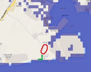 これは、 現在より「海面を5メートル上昇」 させた場合の、野比近辺の地図 です。 (青い部分が、上昇した結果の海面です) 海面上昇を「5メートル」としたのは、 この当時 『あゴー!の道』 が たまに波をかぶるぐらいまでに なっていることから逆算した値です。 また、緑のL字 が、 「ORANGE FOOT」があるとされる曲り道 … 赤丸で かこってある のが、 「千駄ヶ崎隧道」です。 お気づきでしょうか? 実は、海面が 5メートルほど上昇 すると、 トンネルの向こうの 久里浜の居住区は、 大半が水没してしまう のです。 おじさんは 海中からやって来た とでも言うのでしょうか?(笑) |