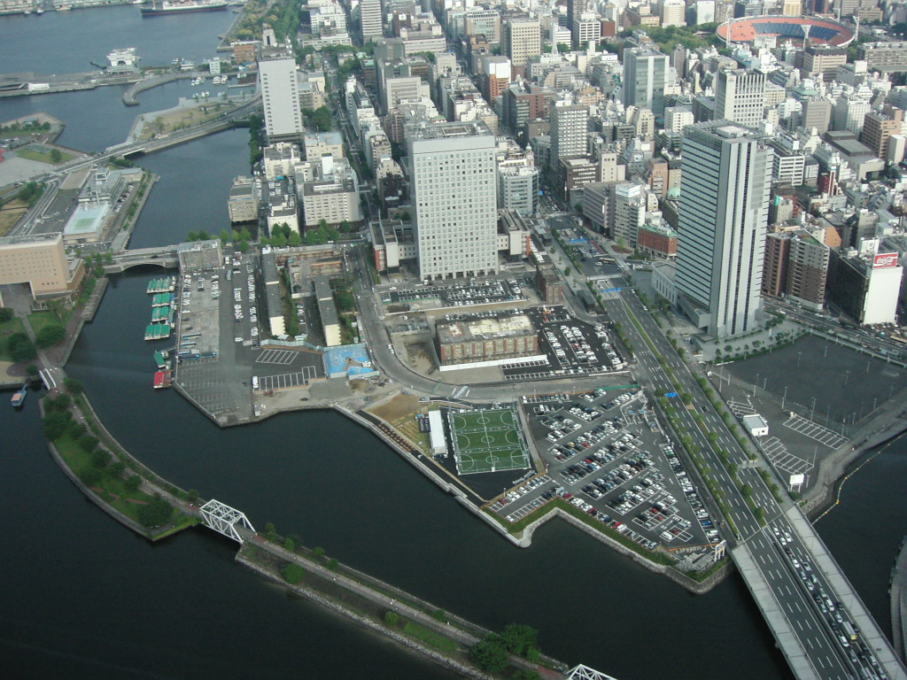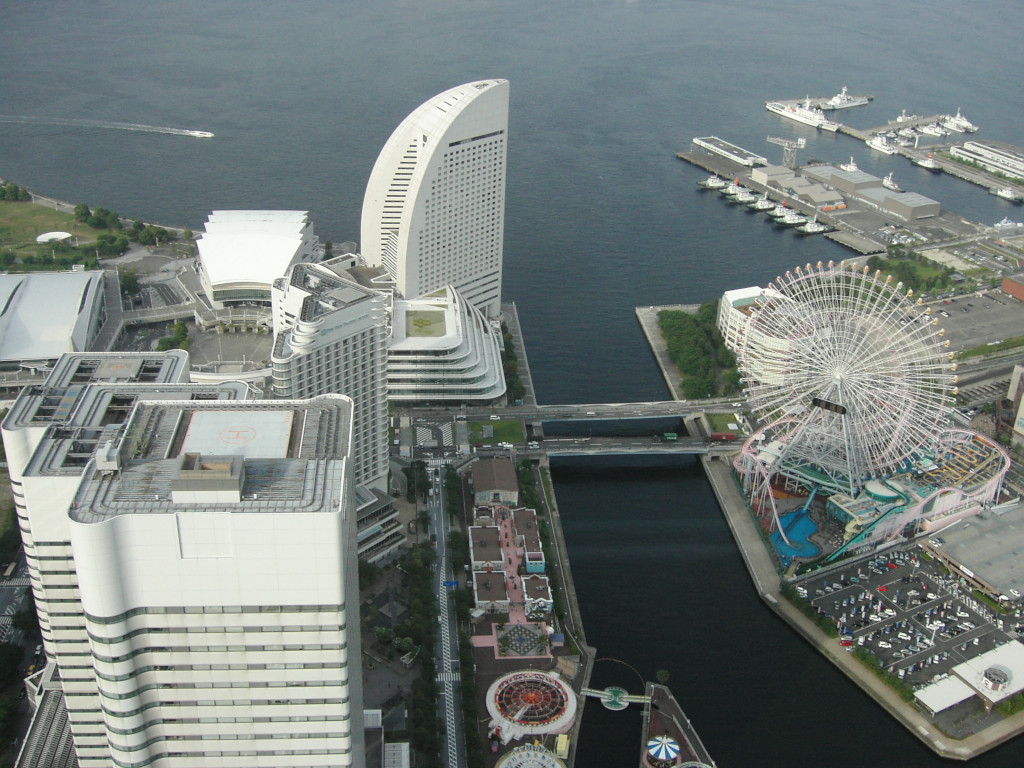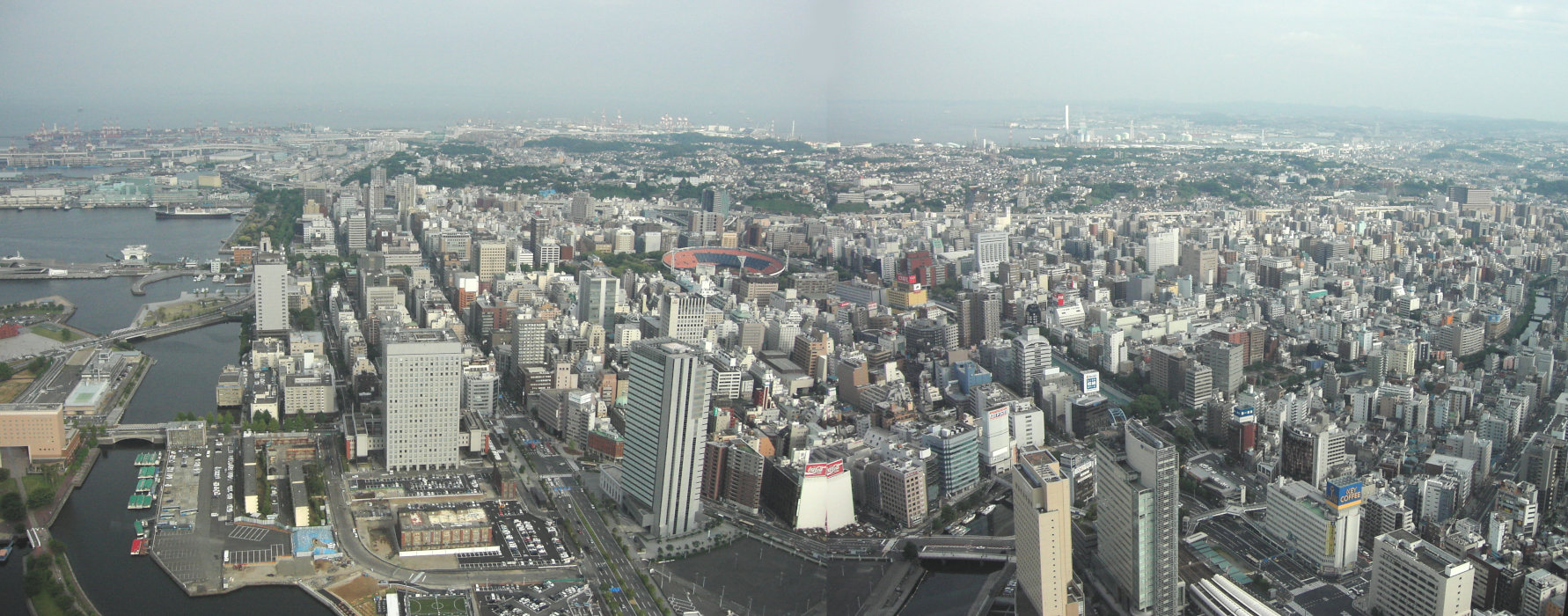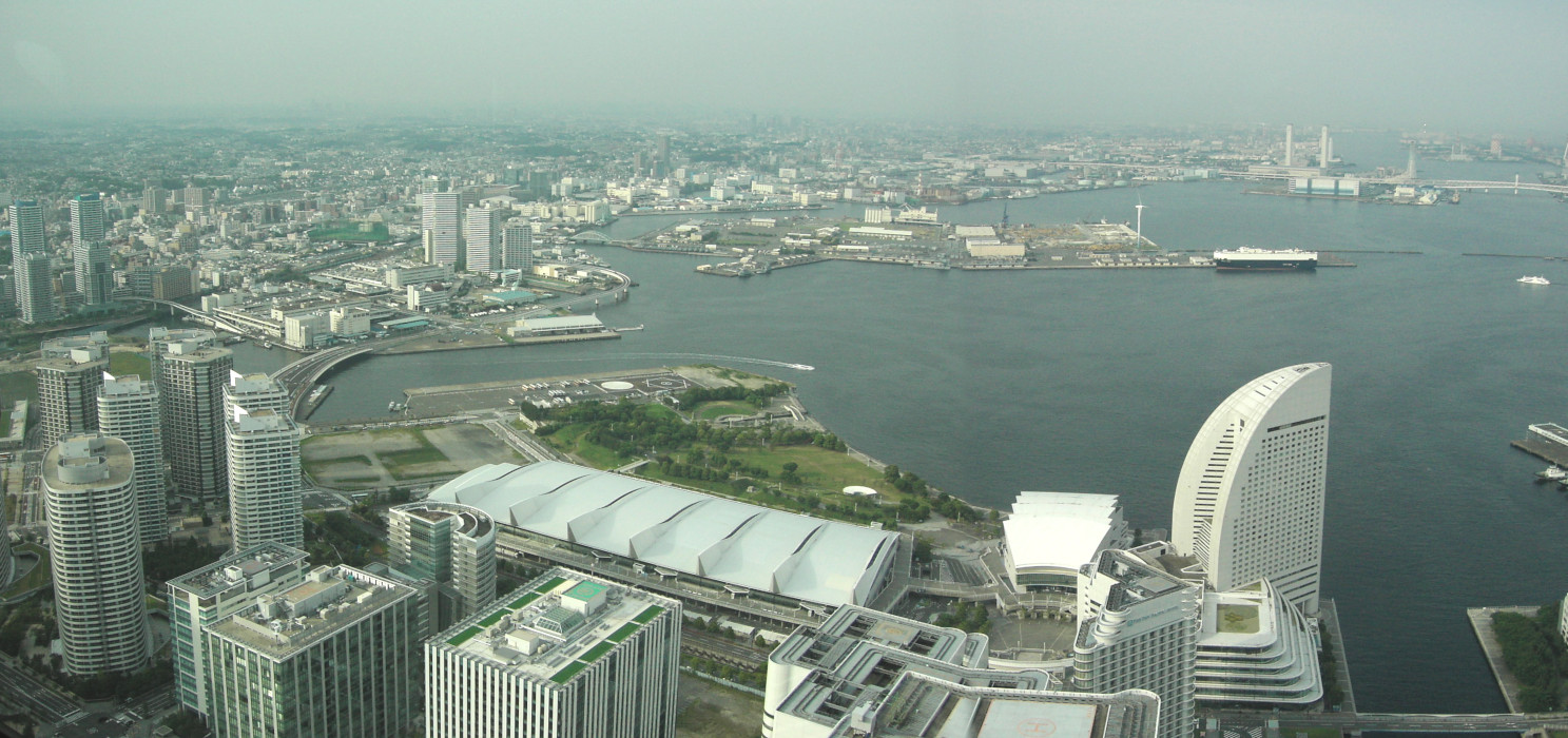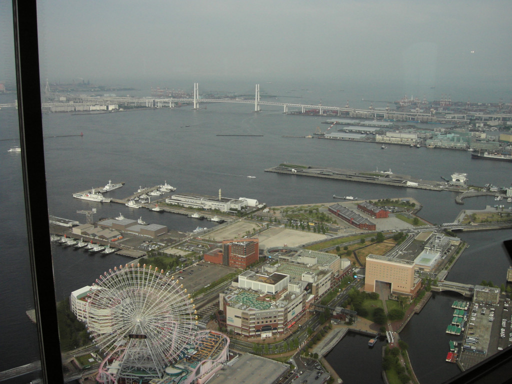 最後は、北東 からの景色です。 横浜港 をほぼ一望でき、 港を取り巻く『ベイブリッジ』、 切ったスイカのような 不思議な形状の 『グランド インターコンチネンタルホテル』など、 実に変化に富んだ光景です。