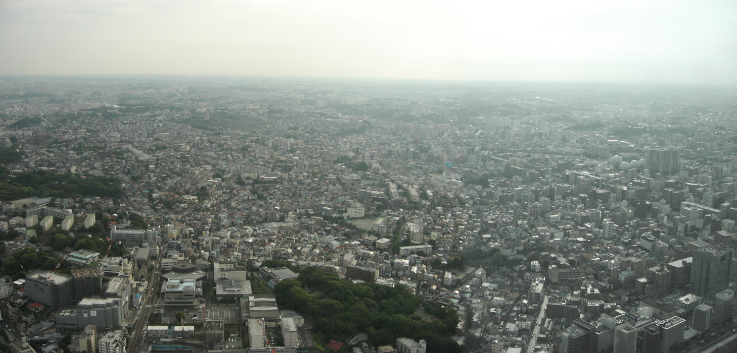 時計回りに進み、 次は 南西 の景色です。 こちらからは、 横浜の商店・住宅の大半 を 見渡せ、 天気が良ければ 富士山 も 見えるはずです。 また、カフェとテーブルがあり、 飲食しつつ風景を楽しめるようになっています。