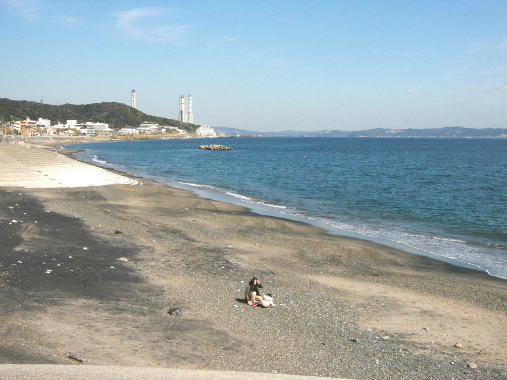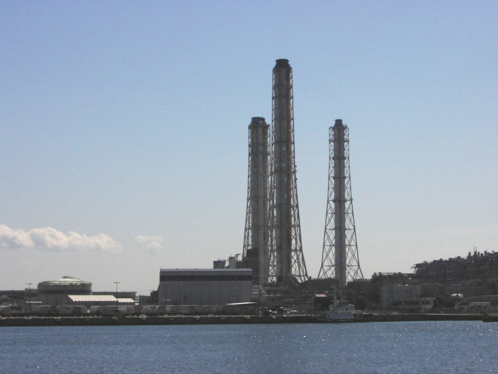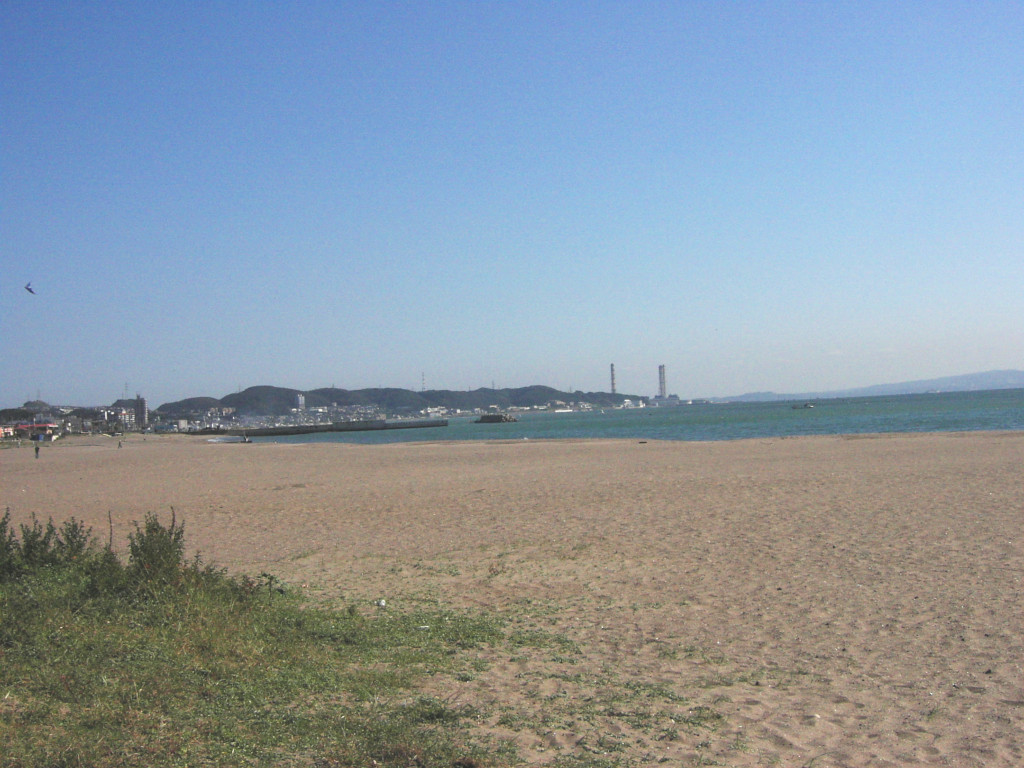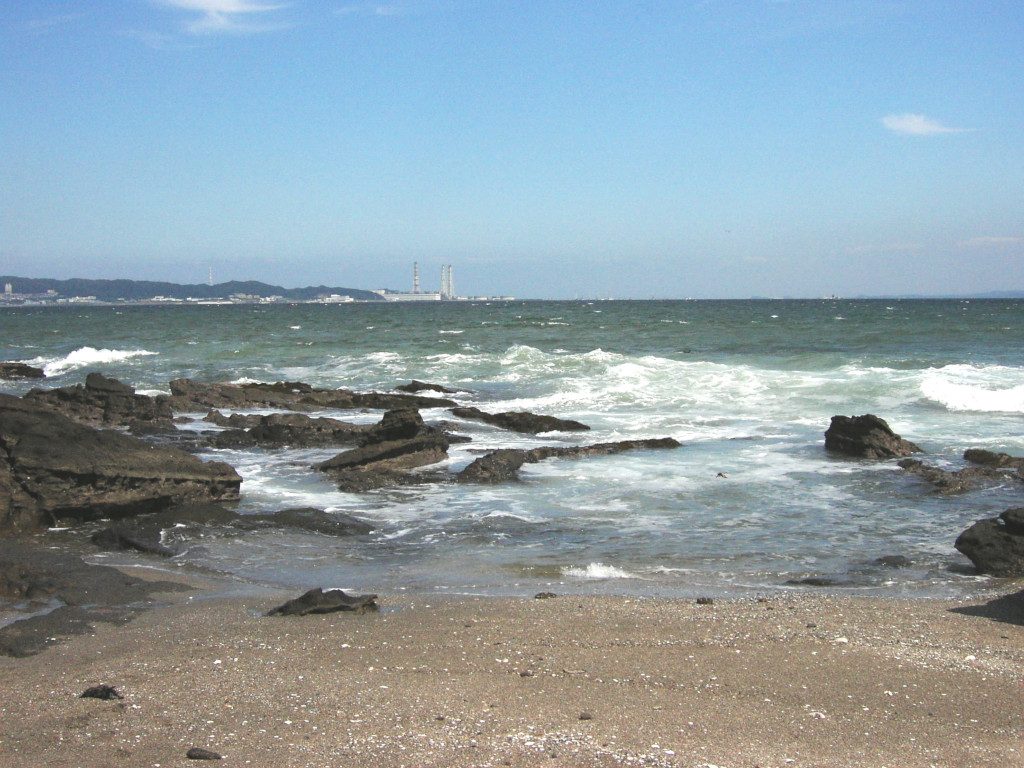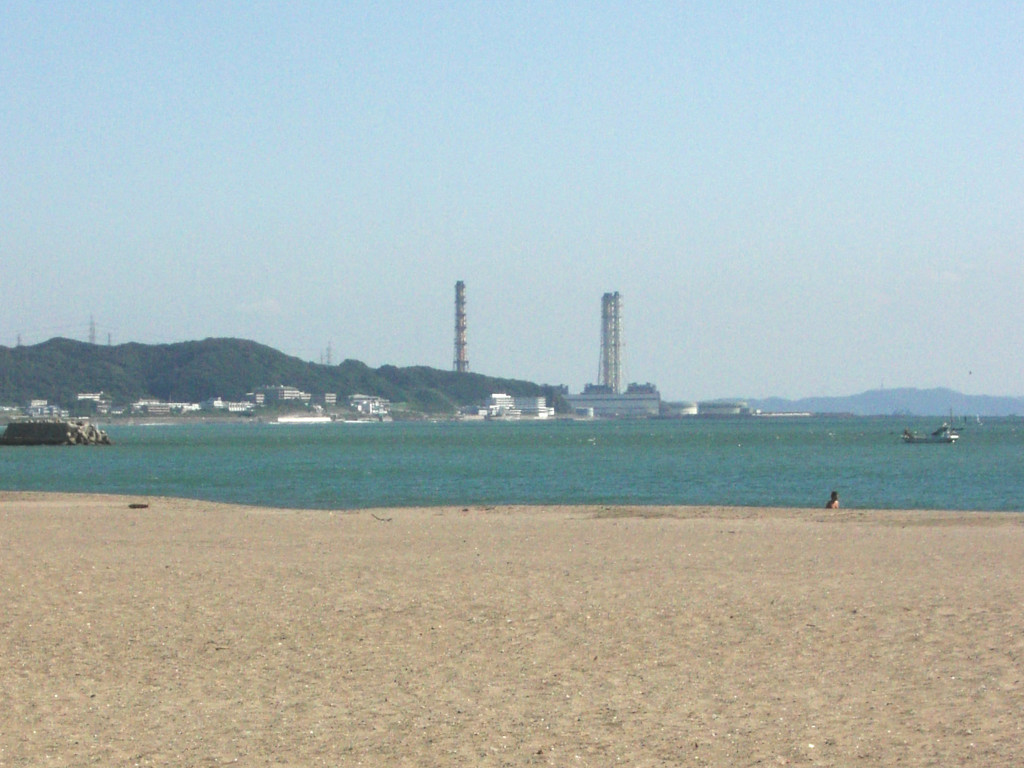 で、これが、現在の 野比海岸 の 中ほどあたりから見た、 横須賀 火力発電所 の 煙突の写真です。 …て、ありゃりゃりゃ??? 「3本」ありますよ? 煙突。