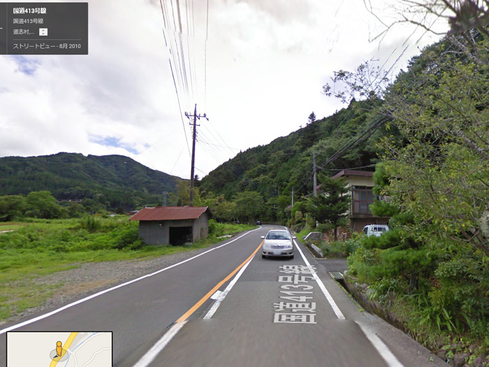 第71話『谷の道』で アルファさんが、 「公園の街路灯のような植物」を 見るために立ち寄った場所… 国道16号線 を北上しつつ、 八王子 までは行かず、谷に入り、 富士山 への近道でもある道路といえば… 国道413号線(道志みち) をおいて 他にないでしょう。 実際、道中の 提灯の表面 には、 まばゆい光の中に かろうじて、 「道志みち」という表記が読みとれます。 「国道413号線 と ハッキリ正体が 割れているのだから、 あとは漫画内のコマと同じような 風景画像さえ入手できれば、 簡単に紹介ページが1つ作れるな…w」 と 考えた僕は、 早速 意気込んで 調査に取りかかったのですが… これが 実は、 予想外に難敵 だったのです。 |