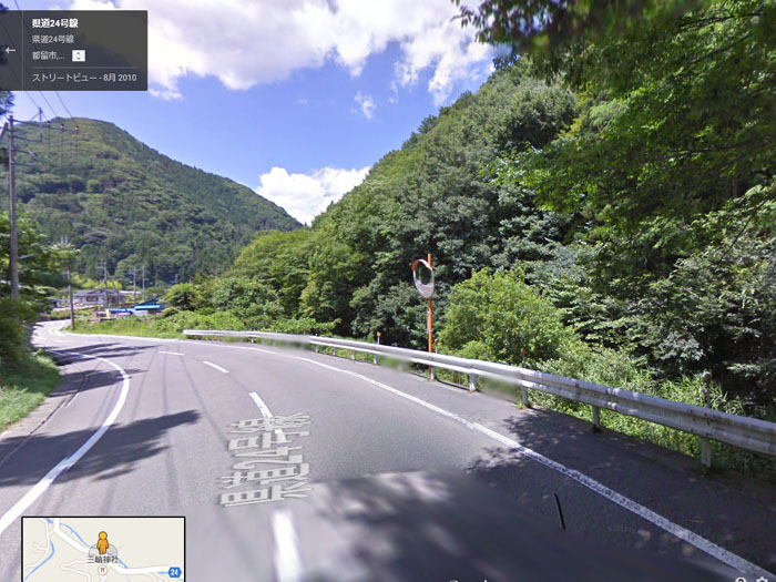 …と 疑問を持ったものの、 漫画内の説明や 提灯に書かれている文字は、 明らかに「道志みち」が モデルであること を示しており、 場所自体が間違っている可能性は、 ちょっと考えられません… だとすれば、漫画内の この道は、 (おそらく 作中で暗示されている 富士山の大噴火 によって) 現代のそれと形状が変わっていたり、 元々あった道が使えず 新たにバイパスが増設 されたりした のではないでしょうか? そう考えて、あらためて 「国道413号線本体ではないけれど、 その近辺に隣接・並走している小さな道」 に関しても、可能な限りチェック してみたのですが… (奥相模湖の東の 県道76号 や、 道の駅近くの 県道24号など…) 結局、「これだ!」と 断言できるほどのポイントは 見つかりませんでした。 以下は、そんな中でも、 比較的「漫画内の風景に近いのでは?」 と思われた箇所 を ピックアップしたものです。 よろしければ、 参考までに ご覧ください。 |
