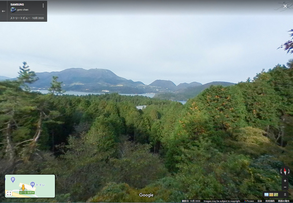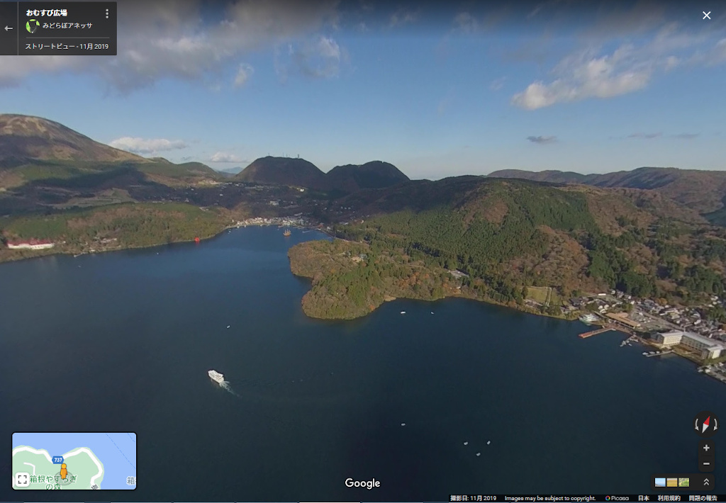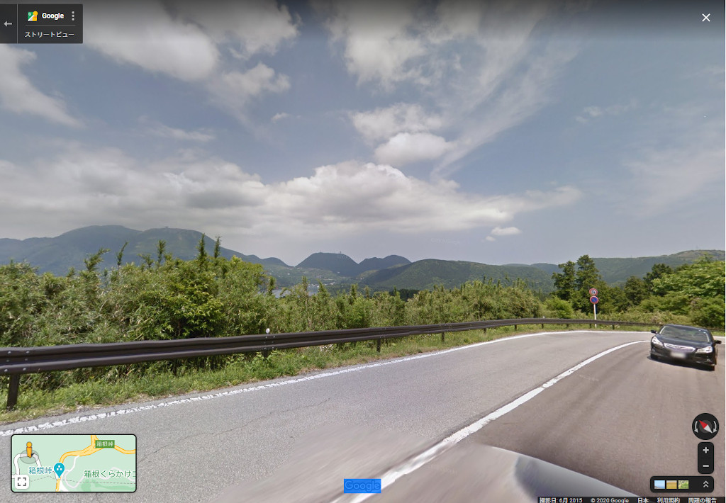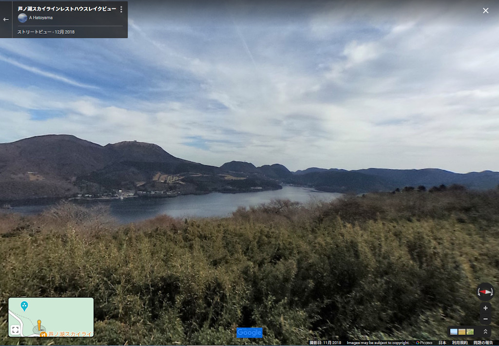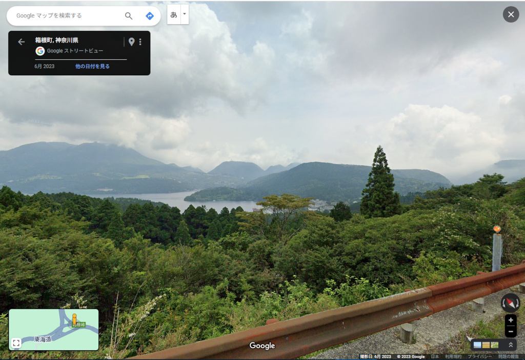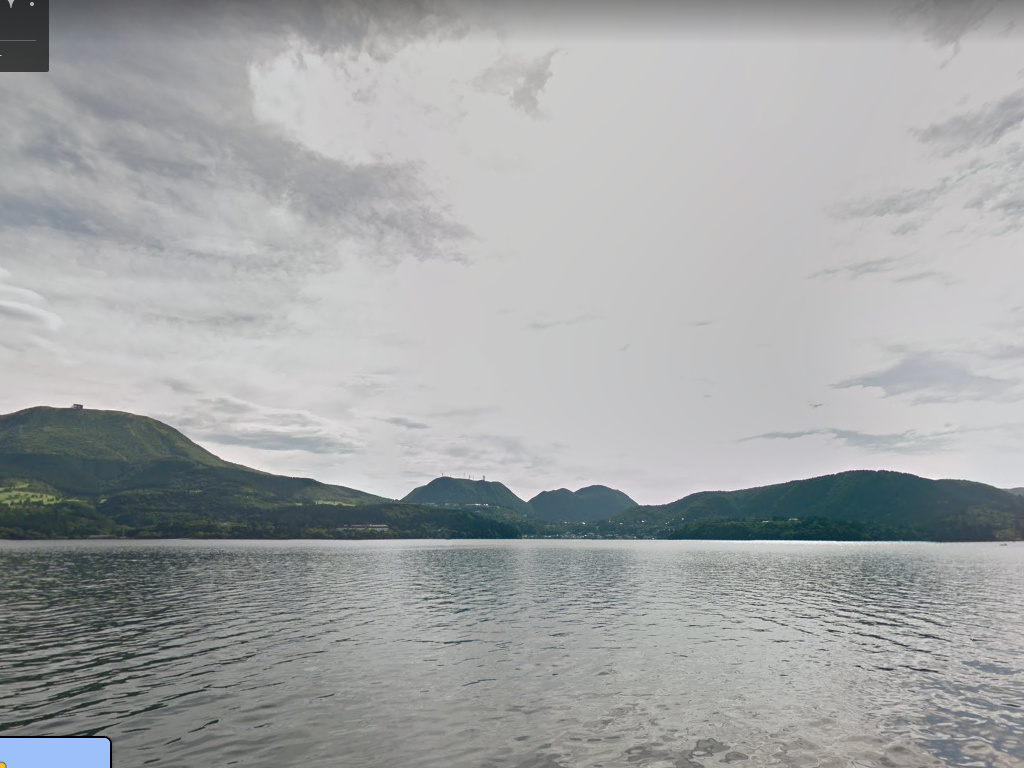 「芦ノ湖」の南の水面上 からだと、 「2つの山の谷間」が 作中のそれより深く見えます。 なので、 もうちょっと 南か北に移動すれば 漫画内の描写に近い視点 が 得られそう です。 そう思って Googleストリートビュー で 走り回りまわったのですが… 「ストリートビューで撮影されている範囲」 に 限りがあったり、 ほとんどの場所で 木々に視界をさえぎられたり して、 一向に 心から納得のいく場所 が 見つからず… 結局、以下に列挙するポイントを 見つけ出すのが精一杯 でした(とほほ) 以下、参考程度に ご覧ください。 |
