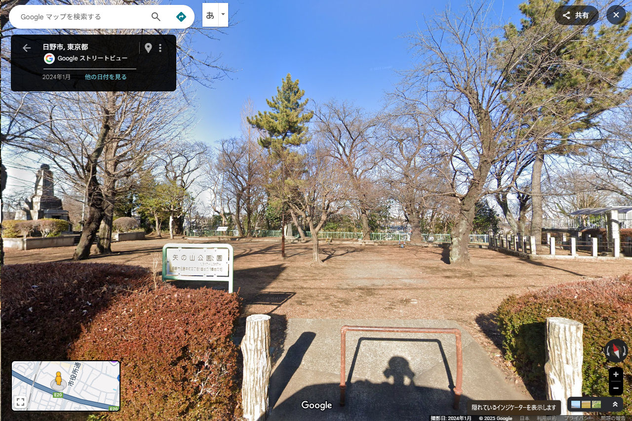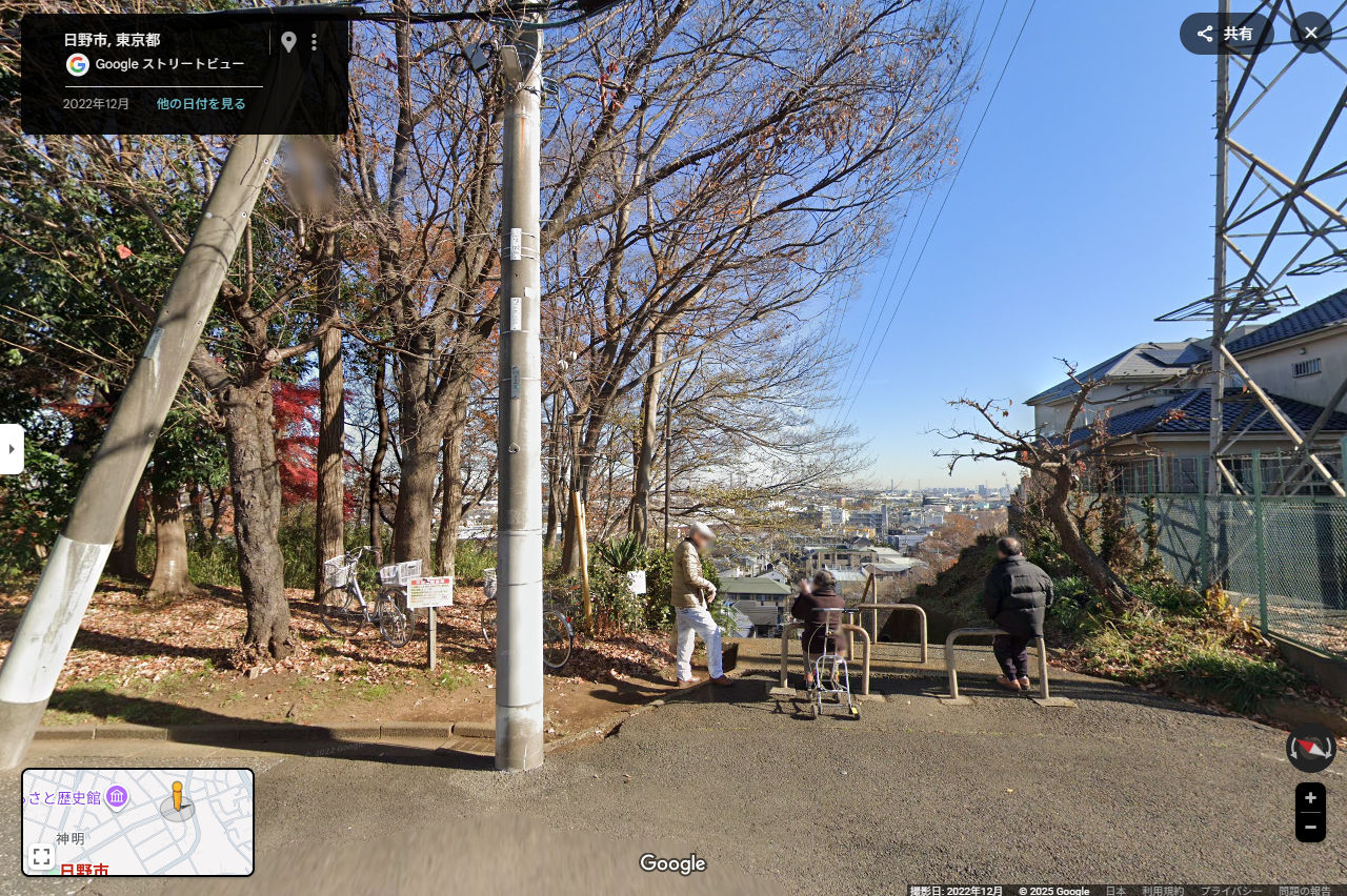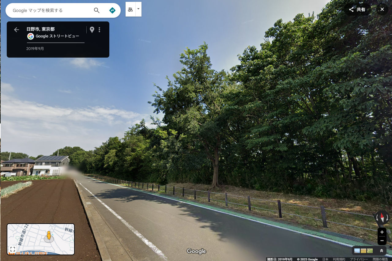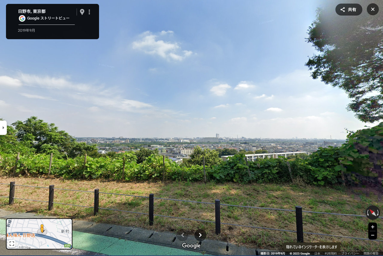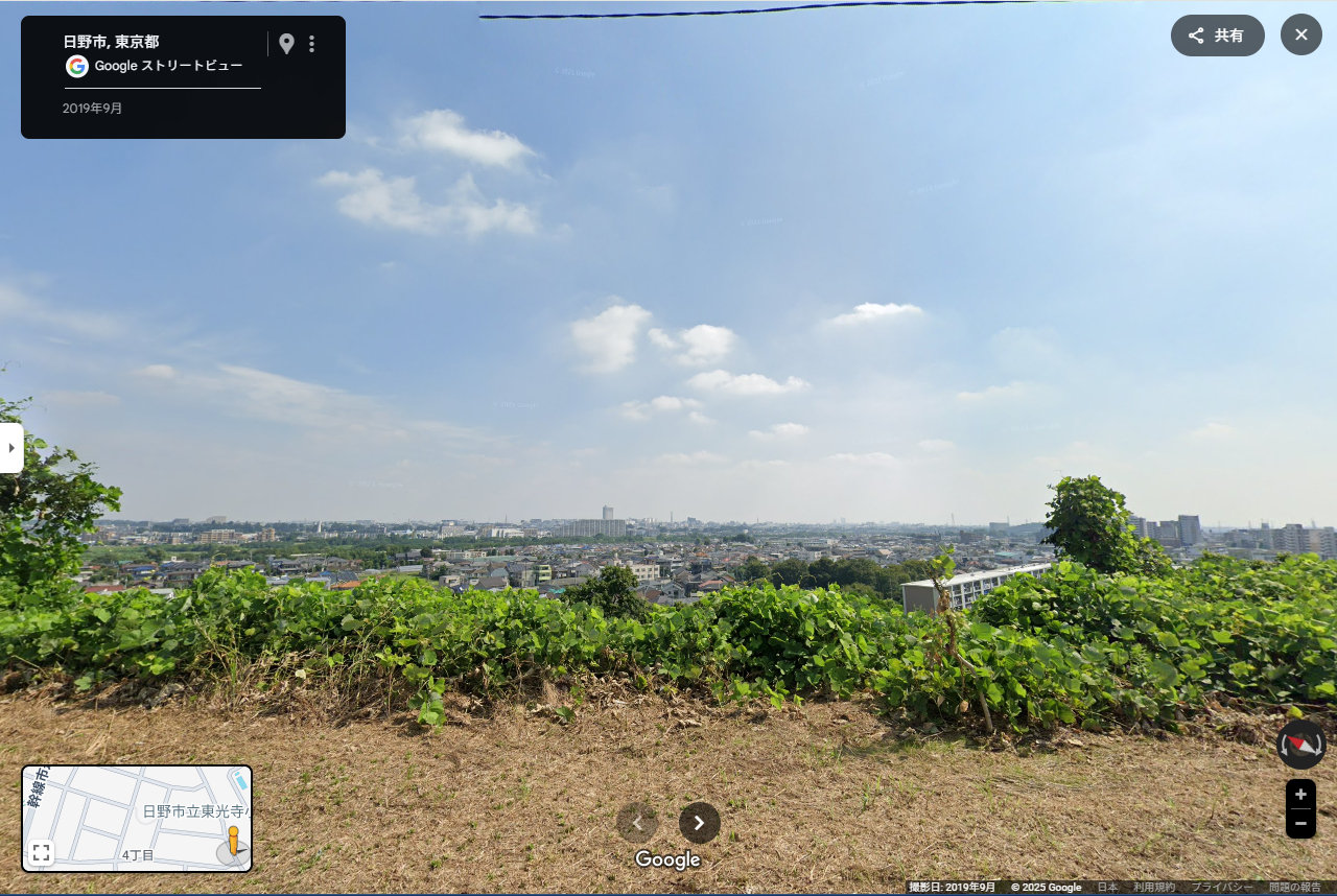 「日野という台地」に さしかかり、 「台地が途切れる崖」から ムサシノの原(関東平野)を見た わけですから、 「日野市内の高台で、 東の方に視界のひらけた場所」 と 考えるのが妥当です。 「これは簡単に特定できそうだなぁ」 と 考えたのですが、 ここを調査しはじめた当時(2010年ごろ)は まだまだ Googleストリートビューの 情報は少なく… また、当時 僕が住んでいた池袋からは、 日野市は微妙に遠く て、 なんだかんだで 後回しにしているうちに、 僕自身が東京を離れることに なってしまい(泣)、今日に至る… という流れだったのです。 ただ、あれから 15年近くが経ち、 ストリートビューも 当時とは 比較にならないほど充実してきた ため、 今なら特定できるのでは…? と 考え、 ついに 2025年9月に 調査を再開 する事にしました。 |