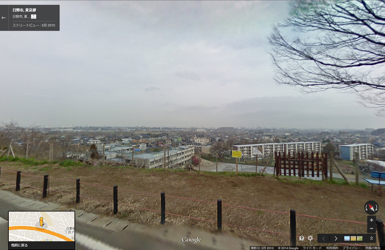 ここの調査を開始した当時(2010年頃)は、 標高もあって 緑も多そうな 『多摩動物公園』あたりが 該当地なのでは? と 踏んでいたのですが… (アルファさんが野火を見た場所も、 周囲に屋台が出ていて「公園」ぽい雰囲気でしたし…) 意外にも 日野 という街は 全体的に 高台 で、 あらためてストリートビューで 歩き回ってみると、 (地形的な)候補が実に多い のです。 しかも、アルファさんが直前に 『大垂水(おおたるみ)峠』を 経由していることを考えると 「国道20号線ぞい」 である可能性が高く… その意味では 日野市 南部の「多摩動物公園」よりも、 北中部の 普通の市街地・住宅街 の方が 良さげにも思えてきました。