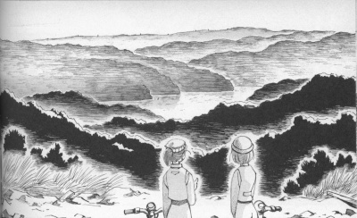 ヒントになったのは、ココネの、 『山の中に変に青く 波のない水面が ありました』という一文… そして、アルファさんがココネに話した、 『くねくね曲がった谷の奥まで入りこんだ海』 という説明です。 ヨコハマは、海面上昇 の時代の物語。 彼女たちの会話から逆算すると、 この場所は、僕たちの暮らす 21世紀 には、 『くねくね曲がった谷になっている、 標高の低い場所』であると推察されます。 |