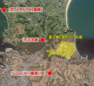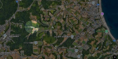 ただ 困ったことに、 三浦市近辺 は「クネクネ地形」だらけ… この点だけ見ると、 候補地は 10は下らない のです。 それで、なかば 特定を あきらめていた のですが… ある日 予想もしない方向から、 特定のキッカケを得る ことになりました。 「Google Earth」で 遊んでいたとき、 『大三叉路』の ちょっと南に、 おもしろい物を発見したのです。 それは、半島の中ほどに なぜかポツリと存在する 小さな池 でした。 この近辺は、周囲をグルリと木々に囲まれた 内部が分かりづらい土地 で、 実は僕も「Google Earth」で見るまでは、 この一帯は、ただ 深い森が 広がっているだけの場所だと、 長い間 信じこんでいた ほどです。